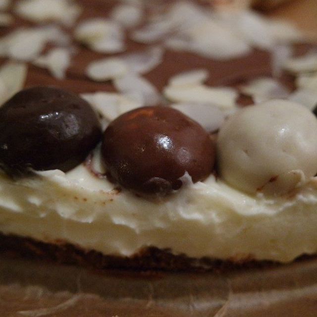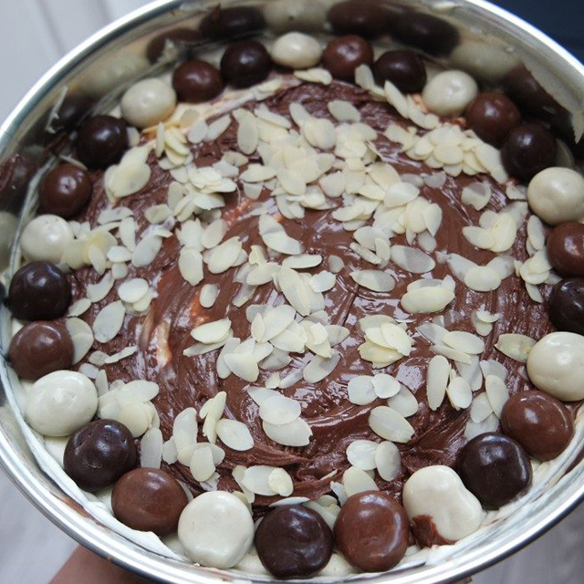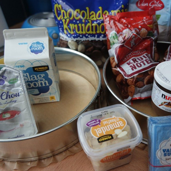 Als de taart goed stevig is, kun je de Nutella er op smeren. Nu is Nutella best lastig om zo over de taart te smeren, dus verwarm deze een aantal seconden in de magnetron. Als de Nutella erop zit, kun je taart afmaken met de chocolade-kruidnoten en het amandelschaafsel. Zet de taart tot slot in zijn geheel nog drie uur in de koelkast.